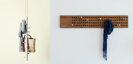 Systèmes de suspension créatifs de Copenhanger (à gauche) et de we do wood (à droite).Grande armoire = grand fourbi