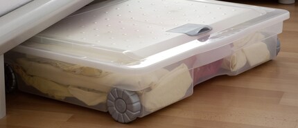 Les habits que l’on ne porte que rarement peuvent être rangés dans une boîte que l’on glisse sous le lit – ni vu ni connu. Photo: Rotho.Plus sur le thème du rangement et de la conservation