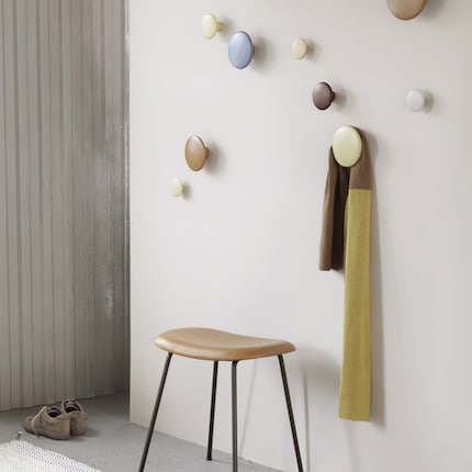 Muuto, une icône: cette constellation de patères permet non seulement d'accrocher des objets, mais fait également office de décoration.Disponibles dans 18 tailles et une variété de couleurs, ces crochets se disposent de mille et une façons; dans l'entrée, pour les vestes, ou dans la salle de bain, les draps de bain. Ils apportent une touche de gaieté et se disposent au gré des envies; du coup, peu importe si d'autres les ont aussi finalement.