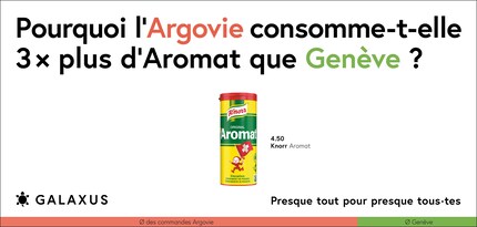 En tant qu’Argovien en exil, il y a bien sûr un sujet qui m’interpelle immédiatement : « Pourquoi l’Argovie consomme-t-elle 3 × plus d’Aromat que Genève ? » Qu’entend-on par là ?! Comment un canton suisse peut-il ne pas avoir besoin d’Aromat ou moins qu’un autre ? Devons-nous maintenant renommer le Röstigraben et le remplir d’Aromat ? Je pars en quête d’indices entre le pays des carottes et la cité de Calvin.