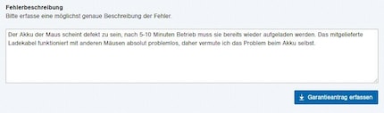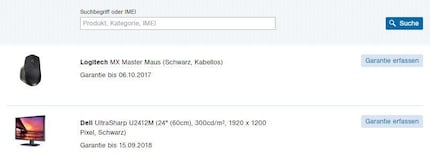 Dans un cas de garantie, une vue d’ensemble de tous les produits commandés et encore garantis est également affichée, et la demande de garantie peut être faite directement en ligne. Dans ce cas, nous encourageons le renvoi direct au centre de service responsable, car le temps d’attente pour le traitement de la garantie peut ainsi être raccourci.