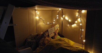 Pas plus tard qu'hier, j'ai construit une petite grotte avec ma fille en un tour de main. Une chaise haute, une boîte Galaxus, des couvertures, des pinces à linge, des coussins, une petite lampe et le projet était prêt. Munie d'un livre et de sa poupée, elle a pu y rester un moment sans problème.