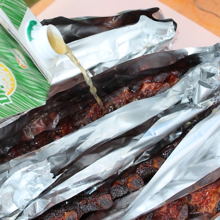Lorsque vous avez terminé la première phase au bout de trois heures, sortez les côtes et emballez-les - avec un peu de liquide - dans du papier d'aluminium. Il est important que les côtes soient emballées hermétiquement pendant la cuisson et que l'air ou le liquide ne puisse pas s'échapper. Je vous conseille d'utiliser du papier d'aluminium résistant à la déchirure, car un papier d'aluminium trop fin risque de se déchirer sur les os qui dépassent déjà après la première phase