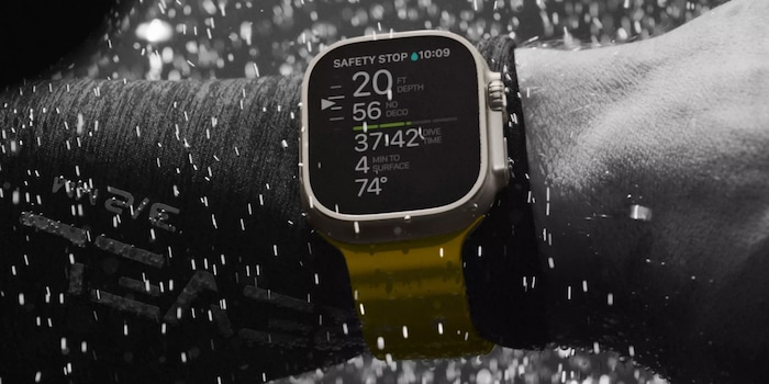 Le mot-clé "eau" a fait l'objet d'un segment spécial lors de la présentation. En effet, l'Apple Watch Ultra doit être spécialement utile aux plongeurs. Côté matériel, la montre est protégée contre l'eau jusqu'à une profondeur de 100 mètres et certifiée selon la norme internationale pour les accessoires de plongée selon EN13319. Il est toutefois recommandé de ne pas descendre à plus de 40 mètres sous la surface de l'eau. Associée à l'application Oceanic Plus, la Watch devrait faire office d'ordinateur de plongée, affichant des informations pertinentes sur le courant et la température de l'eau et permettant de suivre les plongées.