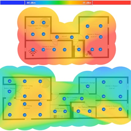 La bande de fréquence de 6 GHz, qui offre le plus grand débit de données, couvre de manière idéale les combles supérieurs. En bas, le balcon et le coin du salon au-dessus, ainsi que la chambre 1 en partie, faiblissent avec des points de mesure de -70 à -74 dBm. La connexion y est à peine maintenue.