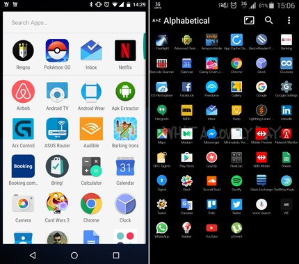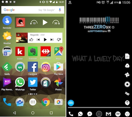 App Tray sur Stock Android (gauche) et Lightning LauncherQuelques lignes et colonnes ont été ajoutées à l’écran pour que ce dernier offre plus de place pour le contenu. Comme décoration, il y a encore le widget Minimalistic Text.