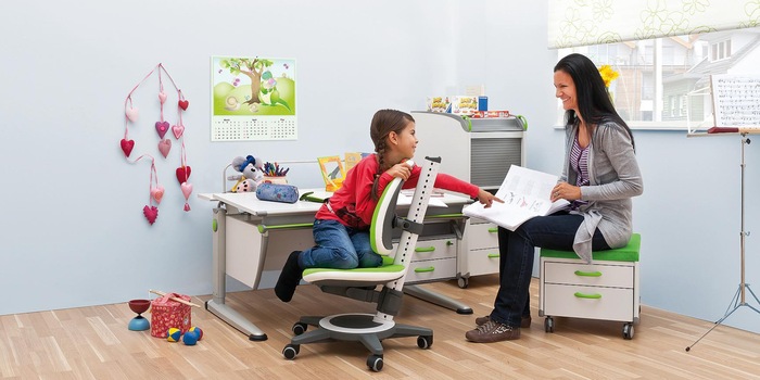 En plus du bureau et de la chaise qui va avec, l’enfant a aussi besoin d’une lampe de bureau, d’une possibilité d’archivage, d’une étagère basse pour ranger toutes les affaires de classe et d’un conteneur roulant.