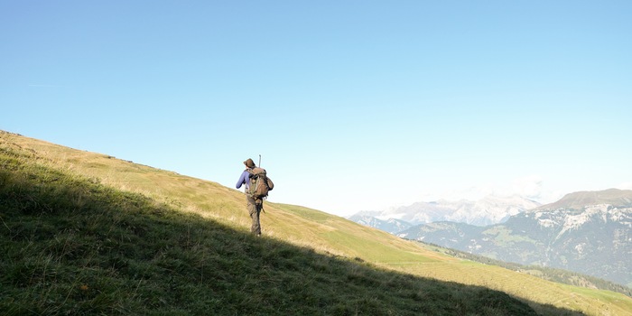 Marco et moi sommes assis dans le noir et attendons. Les premiers rayons de soleil touchent les sommets et baignent la terre devant nous dans une lumière froide. Au bout d'une demi-heure, je réalise douloureusement ce que je sais depuis longtemps : je n'arrive pas à rester en place. Bien que la vue sur les montagnes des Grisons soit sublime, la position est tellement inconfortable que je dois la changer toutes les quelques minutes. Entre temps, Marco est assis là, sans bouger. Avec les jumelles, il observe le terrain devant nous. « Ça va ? » chuchote-t-il. Je hoche la tête – c'est un mensonge. Et me demande si cela ne dérange pas le chasseur expérimenté – Marco chasse depuis 29 ans – de s'asseoir à côté d'un citadin qui n'arrête pas de bouger. Si c'est le cas, il ne le montre pas.