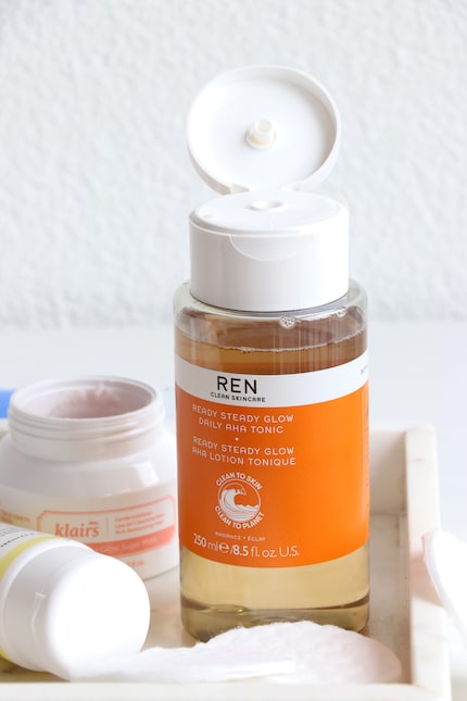 Une fois ma peau nettoyée, j’utilise le tonique à base d’acides de fruits de Ren. Il agit comme un exfoliant chimique doux qui élimine les peaux mortes (enfin, celles qui auraient survécu au premier exfoliant) et stimule la production de collagène. Les AHA (acides α-hydroxylés) qu’il contient lissent le grain de peau au fil du temps et donnent à ma peau un bel éclat après l’application. J'applique une petite quantité de produit sur un disque de ouate, que je passe ensuite sur mon visage.
