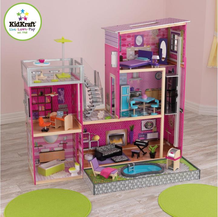 La maison de poupées de KidKraft est une maison de poupées très grande et polyvalente, avec de nombreuses pièces, de superbes détails et un design coloré à la mode. L'amour se cache dans les détails : il y a un ascenseur, un clavier qui produit de vrais sons, et des toilettes dont la chasse d'eau fonctionne. La maison dispose même d'une piscine dans le jardin. L'ensemble complet d'accessoires avec 35 meubles et objets de décoration garantit un plaisir de jeu supplémentaire, assurant qu'il n'y a jamais d'ennui.
