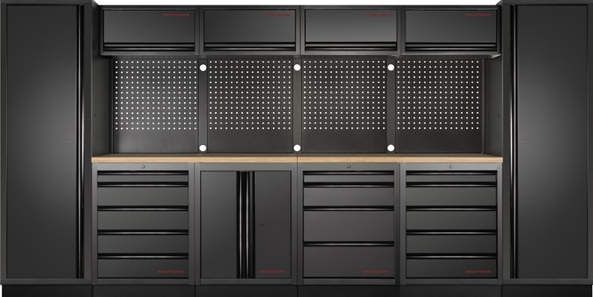 Avec les modules d'armoire "Mobilio Black" de Kraftwerk, l'atelier reste bien rangé