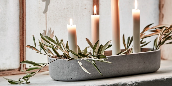 Il marchio House Doctor crea una corona dell'Avvento combinando singoli rami con quattro candele bianche e una semplice ciotola. Quest'ultima è realizzata in pietra polverizzata e resina e crea un contrasto entusiasmante, in quanto emana un tocco industriale anziché la magia del Natale. Tuttavia, la composizione ha un aspetto caldo non appena le candele vengono accese. Puoi facilmente regolare il grado di natalizio con il tipo e la quantità di decorazioni.