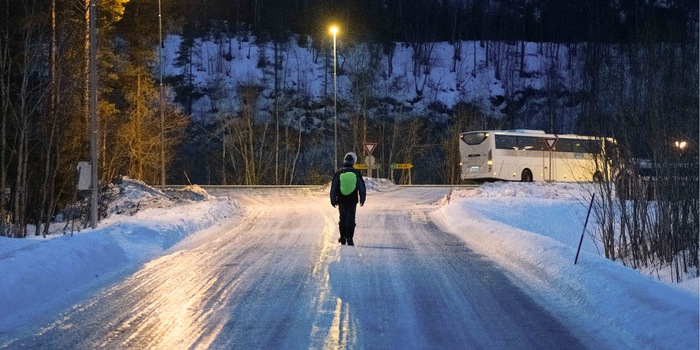 La mattina inizia con il bel tempo e decidiamo di sfruttare la giornata per un'escursione lungo la strada. Per essere il più mobili e tranquilli possibile in caso di avvistamento di alci/animali rari (sì, abbiamo ancora speranza), lasciamo le ciaspole nel rifugio e ci dirigiamo verso il campeggio con solo bagagli leggeri. Quando raggiungiamo la strada ai margini del campeggio, ci rendiamo conto che il terreno è ancora più ghiacciato del giorno prima. Durante il tragitto, incontriamo il proprietario del campeggio, che ci dice che ha piovuto molto durante la notte e che il veicolo per la manutenzione invernale non riuscirà ad arrivare a Røkland prima di sera. I sentieri e le strade privi di neve potrebbero essere "un po' scivolosi" a quel punto.