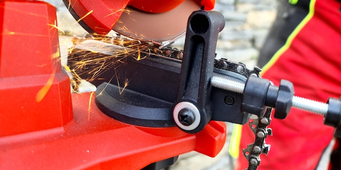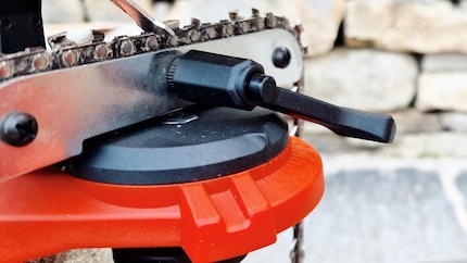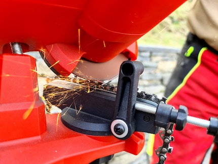 Infiliamo dunque la catena nella barra. L'angolo di affilatura per le catene Stihl è di 30 gradi. Lo regoliamo di conseguenza. Poi con il delimitatore regoliamo la profondità di affilatura per la nostra catena. Di conseguenza, regoliamo anche la tensione per affilare allo stesso modo ogni singola maglia. Usando un calibro, puoi anche definire la lunghezza della maglia più corta e accorciare le altre maglie alla stessa lunghezza. In questo modo dai alla catena un tempo di vita più lungo. Fissiamo infine la catena e iniziamo ad affilare. Mettiamo in funzione il dispositivo, che inizia subito a lavorare a 5 500 giri. Poi spingiamo con attenzione la rotella di taglio verso il basso fino a quando viene bloccata dal delimitatore di profondità. L’affilatura fa sprizzare spesse e abbaglianti scintille.