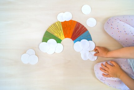Secondo il principio della pedagogista riformista Maria Montessori, cerco sempre di aiutare i bambini a trovare la propria strada verso l'obiettivo. Possono sicuramente realizzare questa idea di lavoretto in modo indipendente. Incoraggia i tuoi figli a contribuire con le loro idee e a sviluppare ulteriormente l'arcobaleno.