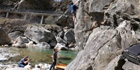 Il «Terreno dei camosci» è stato costruito in brevissimo tempo questa mattina. È ancora presto e c'è tempo per esplorare altri terreni. Oggi Claudio e Marc vogliono esaminare due possibili luoghi per appostamenti rasoterra e rialzati. Hanno individuato un altopiano remoto particolarmente interessante. Dista a circa 40 minuti di cammino dal rifugio, passando attraverso un terreno impervio, un ruscello e infine percorrendo circa 100 metri di scalata quasi verticale su per la montagna.