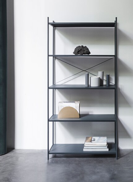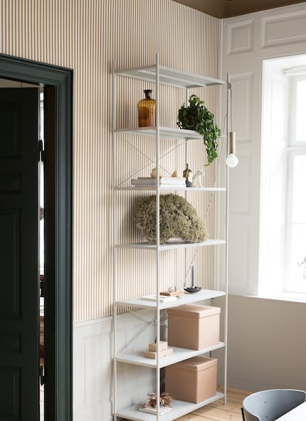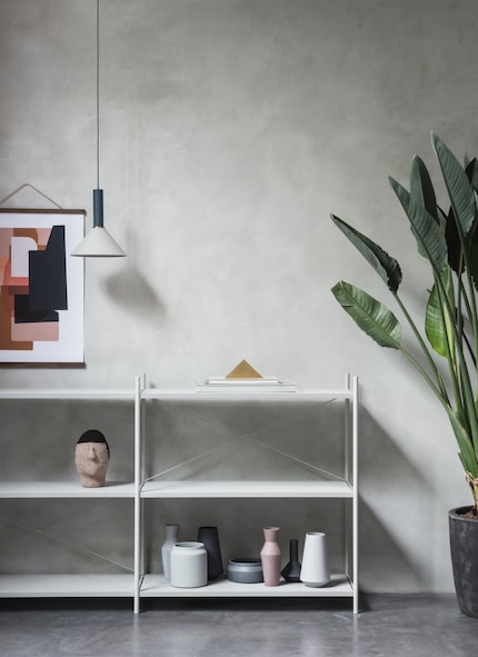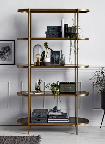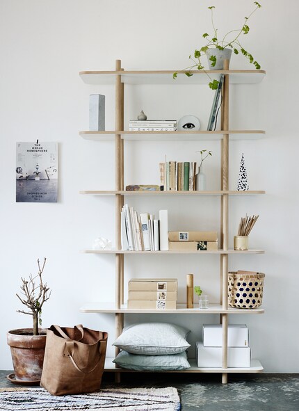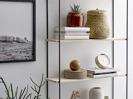 Per un effetto di calma, disponi tutti gli oggetti a forma di piramide. Distribuisci gli oggetti più grandi e le scatole portaoggetti sui ripiani inferiori. In questo modo si distribuisce il peso in modo visivo e pragmatico. Accatasta tutti gli oggetti più piccoli alternativamente verso l'alto.