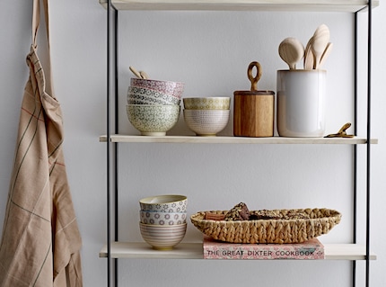 Tratta il tuo scaffale aperto come una mostra che puoi curare con i tuoi oggetti preferiti. Nascondi abilmente tutti gli altri oggetti di uso quotidiano: ti mostrerò come fare.
