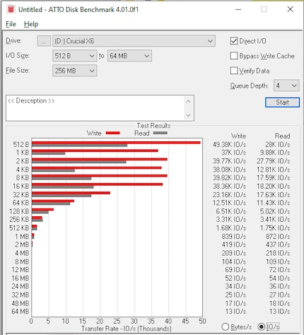Come riscaldamento, eseguo l'ATTO Disk Benchmark, che verifica le prestazioni di lettura e scrittura di varie dimensioni di trasferimento da 512 byte a 64 megabyte. Le specifiche per le prestazioni di lettura e scrittura di molti produttori si basano su questa metodologia, perché fornisce risultati migliori.
