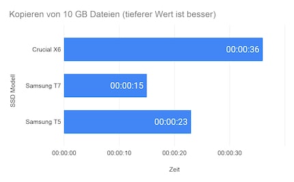 Sulla carta, la velocità dell'X6 non corrisponde ai modelli da 4 TB dei rivali WD e Sandisk. Lì, almeno 1050 MB/s di lettura sequenziale sono all'ordine del giorno. Con 800 MB/s, l'X6 sembra lento. In realtà, però, le differenze sono marginali a seconda del campo di applicazione.