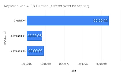 Durante l'ultimo test ho copiato una cartella di quasi 4 GB contenente foto RAW. Anche qui, l'X6 si comporta significativamente peggio del T7: 8 secondi contro 44 secondi. Il T5 ha impiegato solo un secondo in più del T7. In questo caso, la velocità dell'X6 è costante con una media di circa 90 MB/s. Il T7 sprinta fino al traguardo con una costante di oltre 520 MB/s. Il T5 è indietro con oltre 400 MB/s. Le foto RAW sono piccole a circa 24 MB rispetto ai file video. Ci sono più di 160 file nella cartella. Pertanto, i tassi di lettura e scrittura dell'accesso casuale sono ancora una volta più decisivi. Ed è qui che l'X6 è in svantaggio.