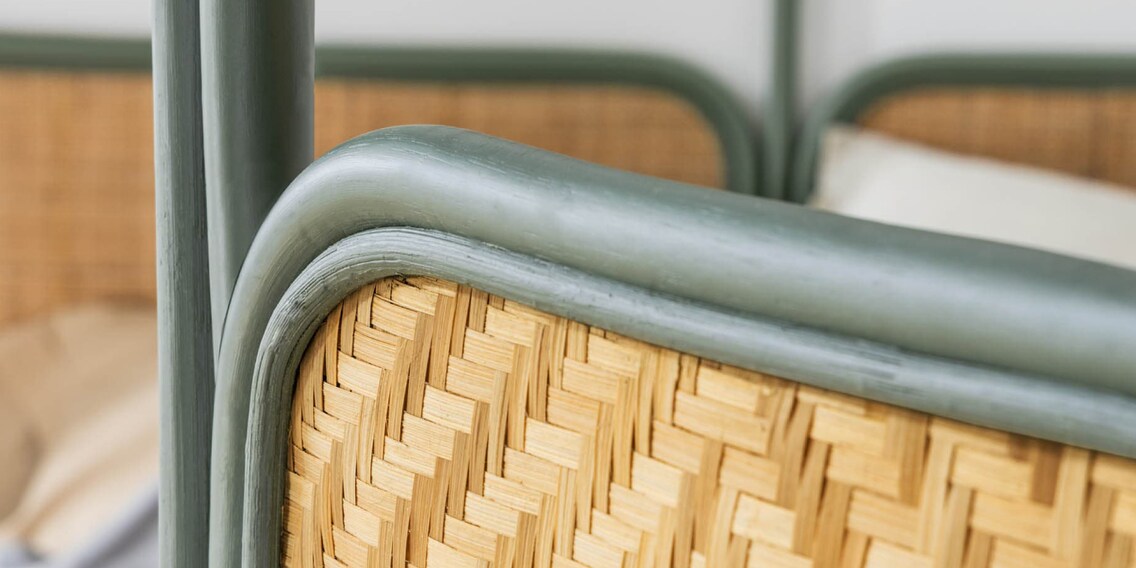 «Margaret» è realizzato in rattan curvo e intrecciato a mano. Questo conferisce al divisorio pieghevole Kave Home una struttura decorativa. Per mettere ancora più in risalto questo aspetto, la cornice intorno ai pannelli in fibra naturale è dipinta di verde. Ma la cornice ha un'altra funzione: grazie agli archi sui pannelli destro e sinistro, può essere utilizzato anche come appendiabiti. Solo che non può nascondere una persona che si sta cambiando. Pertanto, non sostituisce un armadio, ma serve a schermare una scrivania.