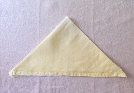 Si può imitare la forma di una foglia con l'aiuto di un semplice drappeggio. Viene molto bene piegando prima il tovagliolo di stoffa in un triangolo. Fai una passata con il ferro da stiro, se vuoi. Solo se vuoi.
