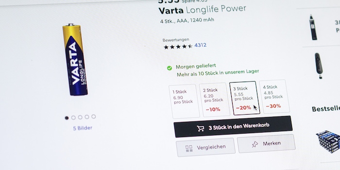 Dei cinque milioni di prodotti presenti nell'assortimento svizzero di Galaxus e Digitec, ben 300 000 sono ora disponibili con uno sconto sulla quantità. Chi acquista quattro confezioni di bevande all'avena Barista di Oatly presso Galaxus, ad esempio, paga il 41% in meno o in più rispetto a una singola confezione (dall'inizio di aprile 2023). Con il cibo per gatti Gourmet Gold, i proprietari di animali domestici risparmiano circa un terzo del prezzo individuale acquistando quattro o più confezioni. Lo stesso vale per le batterie AAA di Varta o lo shampoo per bambini di Weleda.