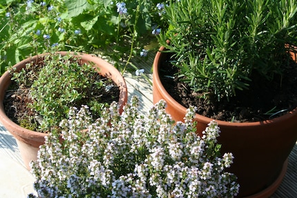 Questo permette al basilico, o al timo mostrato qui, di far spuntare nuovi germogli con foglie alla base delle foglie. Inoltre, impedisce la formazione dei fiori. Infatti, non appena il basilico forma i fiori, tutta l'energia viene impiegata per i fiori e non crescono quasi più nuove foglie. Per le piante che non hanno una crescita ramificata, le singole foglie e gli steli possono essere tagliati a circa 1 cm dal suolo.