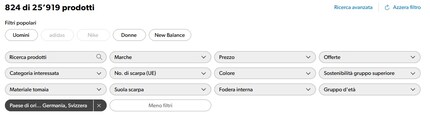 Ma ora Galaxus dichiara apertamente il Paese d'origine di oltre un milione di articoli di moda e abbigliamento sportivo. Le informazioni si trovano sulla pagina del prodotto alla voce «Provenienza». Inoltre, ora è possibile filtrare la ricerca di 91 gruppi di prodotti per «Paese d'origine». La clientela può sfruttare questo filtro per scoprire, ad esempio, quali delle oltre 25 000 sneaker dell'assortimento Galaxus sono fatte in Germania o in Svizzera.