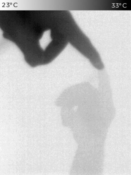 Qui sto toccando il vetro di una finestra. Puoi vedere la mano stessa e, per confronto, il riflesso del calore del vetro.