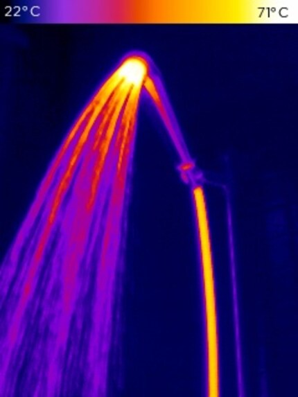 La mia immagine termica preferita mostra il mio soffione della doccia da cui esce acqua calda. Per essere più precisi: acqua calda a 71 gradi.