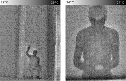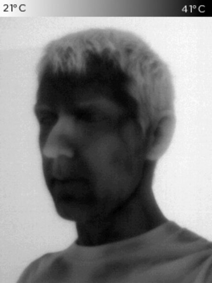 La luce è in gran parte irrilevante, posso scattare foto simili al buio come alla luce del giorno. L'importante è la distribuzione della temperatura. Se la differenza di temperatura è troppo piccola, il soggetto non risalta bene e l'immagine risulta rumorosa. Qui non ho termografato me stesso, ma il vetro di una finestra. Il vetro riflette un po' il calore del mio corpo, ma solo leggermente. Ecco perché le immagini sono completamente rumorose.