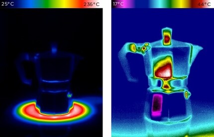 La caffettiera dell'espresso produce interessanti gradazioni di colore, ma solo dopo essersi raffreddata un po'. Al massimo del calore, la differenza di temperatura è troppo grande, quindi non c'è una distribuzione interessante dei colori.