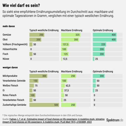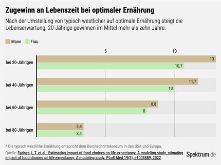 Poiché queste quantità ottimali sembravano un po' irrealistiche se misurate rispetto al consumo reale, i ricercatori hanno cercato un compromesso: la dieta "fattibile". Con questo, gli uomini di 20 anni potrebbero ancora guadagnare più di 7 anni e le donne più di 6 anni. Hanno così ottenuto una buona metà del vantaggio che una dieta ottimale porterebbe.