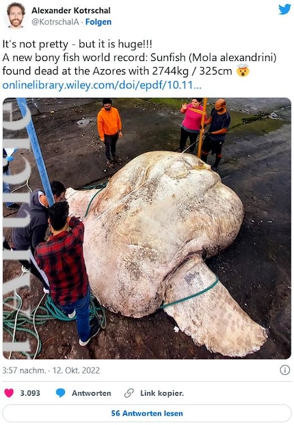I pesci luna o molas compaiono raramente al largo delle coste tedesche, anche se nel 2015 ci sono stati avvistamenti isolati nel Mar Baltico, ad esempio. Di solito si trovano animali morti sulla spiaggia, che possono dare un'indicazione delle dimensioni di questi pesci deformi, che non assomigliano affatto ai loro parenti. Un esemplare particolarmente grande e pesante è andato alla deriva al largo dell'isola di Faial, nelle Azzorre, nel dicembre 2021 e ora detiene ufficialmente il titolo di pesce osseo più pesante conosciuto sulla Terra. Questo è quanto riportato da José Nuno Gomes-Pereira della Portugal's Atlantic Naturalist Association e dal suo team nel Journal of Fish Biology.