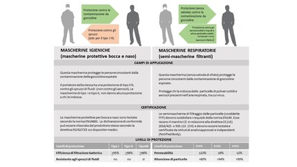 Visualizza tuttiL’insicurezza su quali mascherine utilizzare è tale quanto la disperata ricerca di queste ultime. Quale mascherina mi protegge dal virus? Quale protegge le persone che mi stanno attorno? Quale livello di protezione devo usare? Su Internet si trovano molte informazioni al riguardo. Tuttavia, spesso non sono né aggiornate né complete. Fondamentalmente ci sono tre tipi di maschere: maschere igieniche, maschere respiratorie e maschere fai da te. In gergo tecnico, le mascherine respiratorie sono chiamate anche «semimascherine filtranti a particelle», le mascherine igieniche anche «mascherine di protezione della bocca e del naso» e le mascherine fai da te «maschere di comunità». La seguente illustrazione mostra le caratteristiche principali delle mascherine igieniche e delle mascherine respiratorie. Qui trovi un articolo dettagliato sull'argomento.