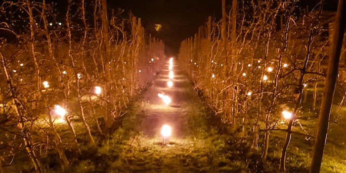 Ma mio fratello non ha un impianto di irrigazione di questo tipo, motivo per cui la seconda notte dobbiamo recarci nel frutteto. Alle 2 del mattino la temperatura scende sotto -1°, mettendoci in ginocchio. Per fortuna, solo letteralmente. Dobbiamo infatti accendere circa 400 candele, che mio fratello ha posizionato la sera prima tra gli alberi.