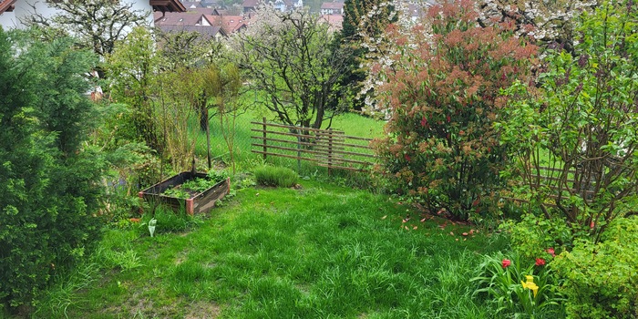 Visualizza tuttiDue anni fa ho eliminato il problema riempiendo la parte del prato con ulteriore terra. A questo scopo, ho fatto consegnare da un contadino del villaggio due metri cubi di terriccio humus finissimo. Dopo che tutto era ben livellato, ho sparso i semi del prato. Il mio piano prevedeva che entro l'estate il prato sarebbe cresciuto al punto da poter essere utilizzato, soprattutto per la nostra piscina per bambini. In effetti, l'erba cresceva, anche se molto lentamente. Ma non mi piaceva molto. La crescita dell'erba era meno fitta dei capelli della leggenda del coaching Gilbert Gress. Non appena ho tagliato di nuovo l'erba, si intravedeva del terreno marrone tra i singoli ciuffi.