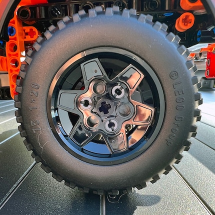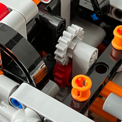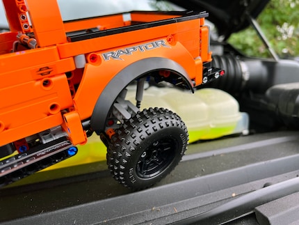 Particolarmente intelligente è una ruota dentata rossa che nel modellino finito non si vede quasi, tranne quando si apre il cofano del motore. Il volante sul cruscotto del Raptor non funziona: è solo decorativo. Al suo posto, però, c’è una ruota dentata sul tetto che controlla lo sterzo. Un sistema di aste va dal tetto sotto al vano passeggeri, fino alle ruote anteriori. Il sistema incrocia così il motore V6, perché il tirante dello sterzo arriva a poggiare sull’azionamento mentre le sospensioni dell’asse delle ruote sono sotto. La ruota dentata rossa gira a vuoto intorno alla struttura dell’azionamento e collega in modo intelligente le ruote allo sterzo, senza complicare inutilmente il modellino o rubare altro spazio.