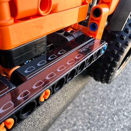 Ecco perché ci sono gli adesivi. Solo due pezzi sono già stampati: i parafanghi posteriori su cui compare il logo del Raptor. Su tutto il resto – cofano posteriore, fari, cruscotto, pedane, mascherina del radiatore e targa – gli adesivi devi metterli tu. Anche se una volta applicati gli adesivi si presentano bene, questa cosa non mi è piaciuta. Sembra quasi che gli ingegneri Lego abbiano cercato la soluzione più rapida per risolvere il problema. Non è possibile montare dei fari veri per motivi di spazio? Vai con gli adesivi!