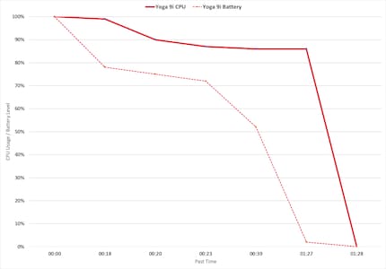 Lo Yoga 9i ha una batteria da 75 Wh. Nel seguente test di streaming video continuo, il dispositivo beneficia del fatto che il processore ha anche core efficienti meno affamati di energia. Sono un vantaggio anche per il lavoro in ufficio quando non modifico decine di immagini su Photoshop o renderizzo un video. Tuttavia, nel seguente stress test non servono a niente, perché misuro per quanto tempo resiste con le prestazioni massime.