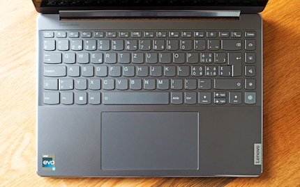 La particolarità della tastiera dello Yoga 9i è la fila aggiuntiva di tasti funzione a destra. Il primo dal basso è un sensore di impronte digitali che, come la fotocamera a infrarossi, sblocca il notebook in modo affidabile. Poi c’è un pulsante per la modalità scura, uno per passare da una delle tre modalità audio all’altra (video, musica e gioco), uno per sfocare lo sfondo delle videochiamate e uno per cambiare la modalità di prestazione (miglior risparmio energetico, uso equilibrato, migliori prestazioni).