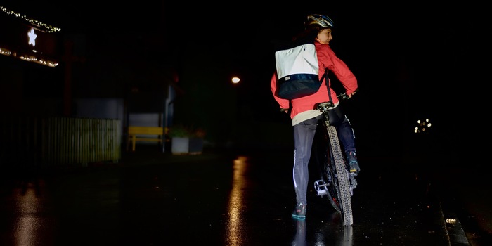 Ho quindi cercato dei modi per rendermi più visibile. Certo che ho già sentito parlare dei gilet riflettenti. Tuttavia, portando quasi sempre uno zaino sulle spalle, questi gilet mi sembrano poco pratici. Indossarne uno sopra lo zaino è certamente scomodo e sotto lo zaino non serve a nulla.