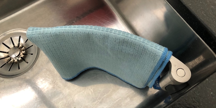Importante da tenere a mente è il fatto che ci sono strofinacci di diversi spessori. Quelli «normali» sono fatti di tessuto non tessuto e microfibra e sono abbastanza spessi da cadere bene su entrambi i lati del supporto anche dopo la strizzatura. E poi ci sono i panni in spugna come questi. E come suggerisce il nome, sono più spessi. Più che altro risultano essere come una fetta di spugna. Questi modelli sono più duri e fanno fatica a stare bene sul supporto. Pertanto, ti consiglio di trovare un altro modo per asciugarli.