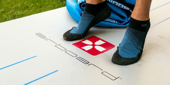 Il parente più prossimo di questo rettangolo è senza dubbio il SUP. Dal materiale, alla valvola, alla pompa, tutto lo ricorda, quindi va bene anche in acqua. La pagaiata non è ovviamente possibile a causa del fattore di forma e della pinna mancante, e non è nemmeno così rigido. L'Airboard Bounce è predestinato a essere un'isola balneare. Trasporta 160 chili, offre due metri quadrati di spazio anche nella versione «piccola» e fa a meno di fastidiosi attacchi su cui i bambini potrebbero ferirsi. A parte la valvola sul lato stretto, ci sono dei ganci sul lato lungo per la cinghia di trasporto, tutto qui.
