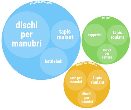 Quale attrezzatura è particolarmente apprezzata nelle economie domestiche svizzere? Questo gennaio, i tappetini per lo yoga e le bande elastiche per il fitness sono finiti più frequentemente nel carrello virtuale – in tutte le parti del paese. La crescita più forte si è vista nella domanda di attrezzature più pesanti: nella Svizzera tedesca, sono le aste per manubri ad essere particolarmente richieste, mentre nella Svizzera francese sono i dischi – cioè i pesi per l’asta per manubri – i prodotti più richiesti.
