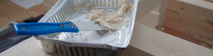Ho riempito i giunti, le aree irregolari e i fori delle viti con colla per legno e segatura. Dopo l'asciugatura, c'erano molti meno spazi vuoti e la costruzione aveva un aspetto più gradevole. I punti di colla più irregolari sono stati poi levigati con la levigatrice.