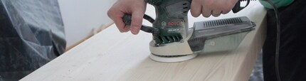 Sabbia al chiuso o all'aperto? In quel periodo il tempo era piovoso, il che rendeva impossibile lavorare all'esterno. La stanza era già sporca a causa del lavoro precedente. Ho quindi deciso di continuare il lavoro all'interno e di appannare la stanza con la polvere di legno. Ho indossato una maschera antipolvere e siamo partiti. Naturalmente l'apparecchio ha un filtro che cattura molte polveri sottili, ma in seguito c'era ancora molta polvere in giro per la stanza. Per prima cosa ho utilizzato una carta vetrata con grana 120. Nella seconda passata con la levigatrice, ho utilizzato una carta di grana 240. A cena sentivo ancora una leggera vibrazione della macchina sulle mie mani.