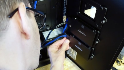 Visualizza tuttiPosizioniamo gli HDD negli slot sul retro. Non si vedono nemmeno dalla parte anteriore. È un vero sollievo non dover avvitare i dischi rigidi. Una volta era un abominio per me. Corsair ha ideato qualcosa di speciale per le unità SSD. Il retro, dove si trova l'ingombro dei cavi, è accessibile attraverso una doppia porta. All'interno di questi sportelli sono presenti sei slot per gli SSD. Purtroppo uno di questi è inutilizzabile perché si trova esattamente all'altezza dell'alimentatore ITX e quindi lo sportello non può più essere chiuso. Ma non è un grosso problema, visto che stiamo installando "solo" quattro SSD.